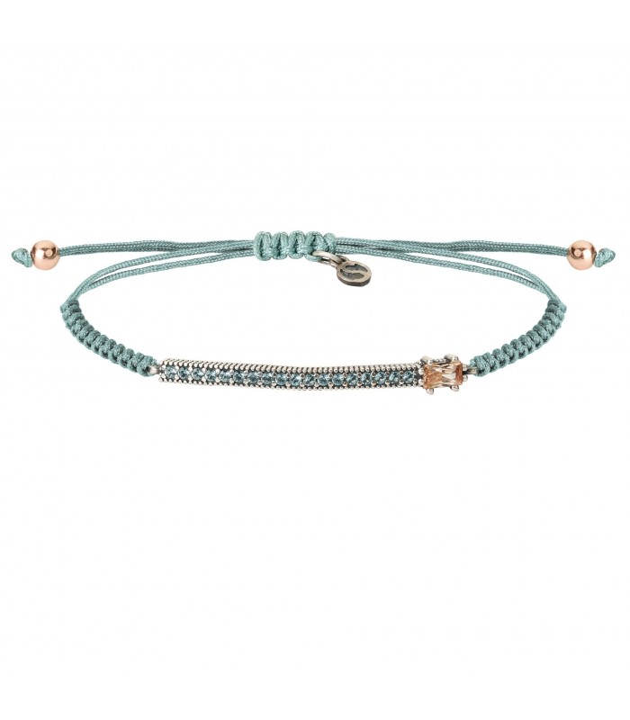 Està realitzada amb plata de llei amb acabat envellit. Les circonites són color aiguamarina talla brillant de 1,5mm i estan clavades a mà i circonita talla baguette facetada de color mel. Macramé amb niló color blau i boletes de plata amb bany d'or rosa 2