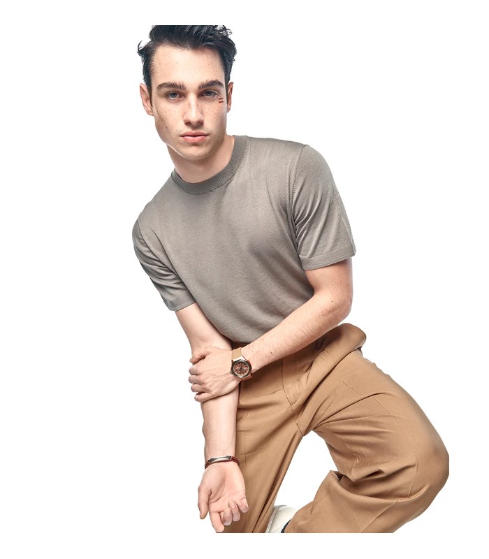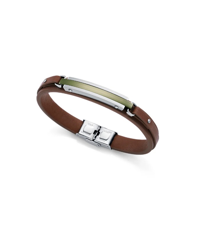 Polsera per a home que combina estil i durabilitat en un disseny modern. Confeccionada amb corretja de pell marró, aquesta polsera presenta una placa d´acer i alumini en to verd. Llarg de 21,5 cm, s'adapta còmodament a la majoria dels canells masculins. És el complement perfecte per a qualsevol conjunt.
