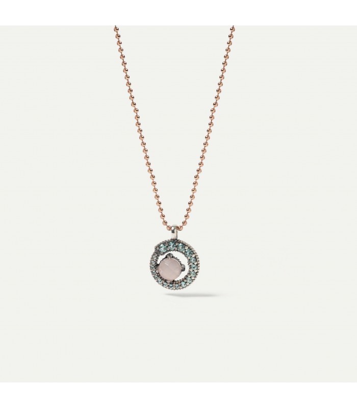 Penjoll de plata de llei amb centre en quars rosa facetat, envoltat de circonites color verd menta en diferents mides, amb un diàmetre total de 1,2 cm. Es presenta amb cadena de boletes de plata de llei amb bany d'or rosa de 24 kt i 42 cm de longitud.