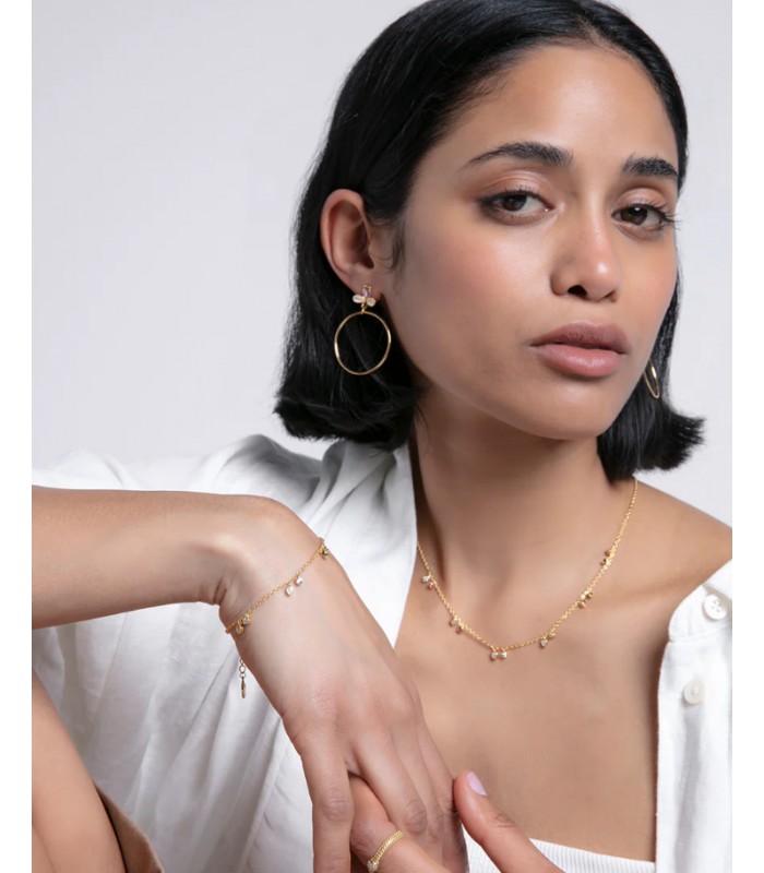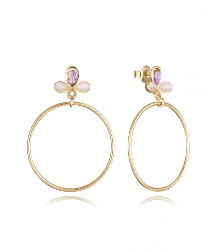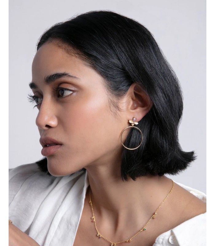 Pendientes de plata de ley con baño de oro y flor con circonitas en color rosa y aro colgante.